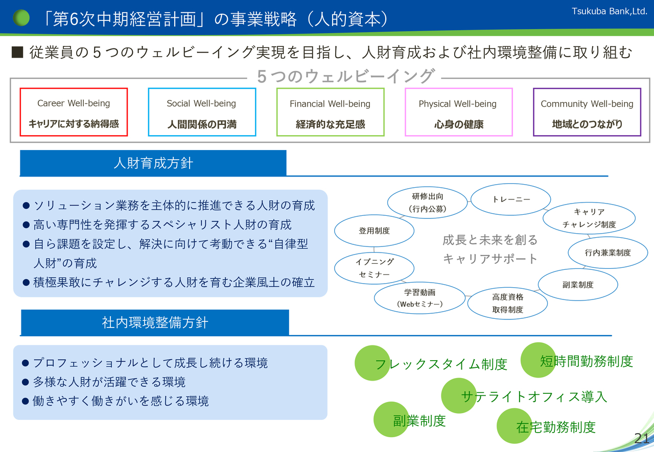 「第6次中期経営計画」では、人的資本の最大化を図るため、人財情報のプラットフォームとして資料中段記載の「タレントマネジメントシステム」を導入し、人財情報の一元管理を行い、人財の適正配置、能力に応じた育成、公正な評価、能力ある職員の積極的な登用を行っています。