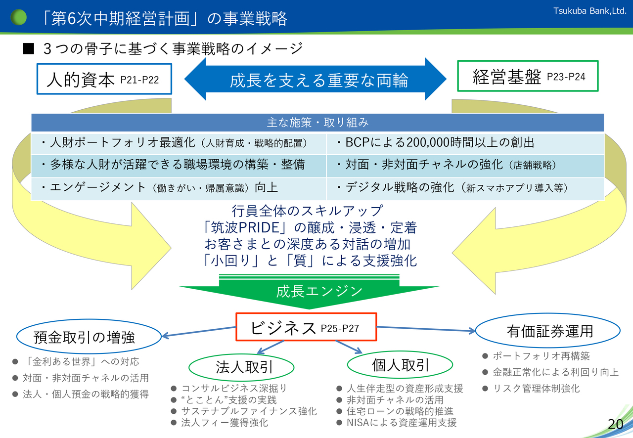 「第6次中期経営計画」では、人的資本、経営基盤、ビジネスの3つの骨子に区分し、それぞれの事業戦略に基づく諸施策に取り組むことで、最終期である2028年3月期に設定した財務指標の達成を目指します。人的資本と経営基盤の成長を支える重要な両輪として、それぞれの施策を着実に履行することにより、行員全体のレベルアップと「筑波PRIDE」の醸成・浸透・定着を図ります。