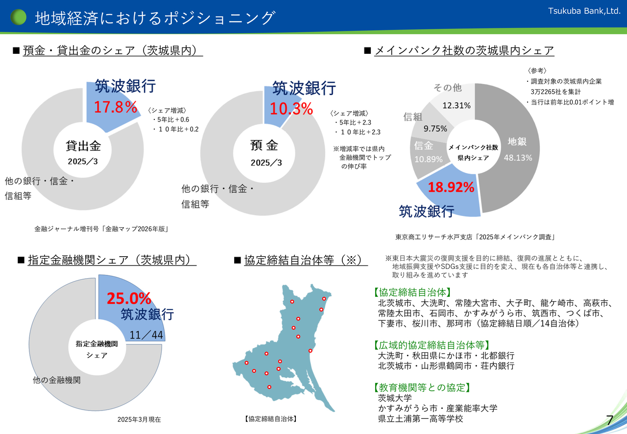 下段の円グラフ、「茨城県内の指定金融機関のシェア」ですが、当行のシェアは25パーセント、つまり、茨城県内の自治体44のうち11の自治体の指定金融機関を務めています。指定金融機関は、自治体のメインバンクのような役割を担うことから、高い信用力が必要とされています。