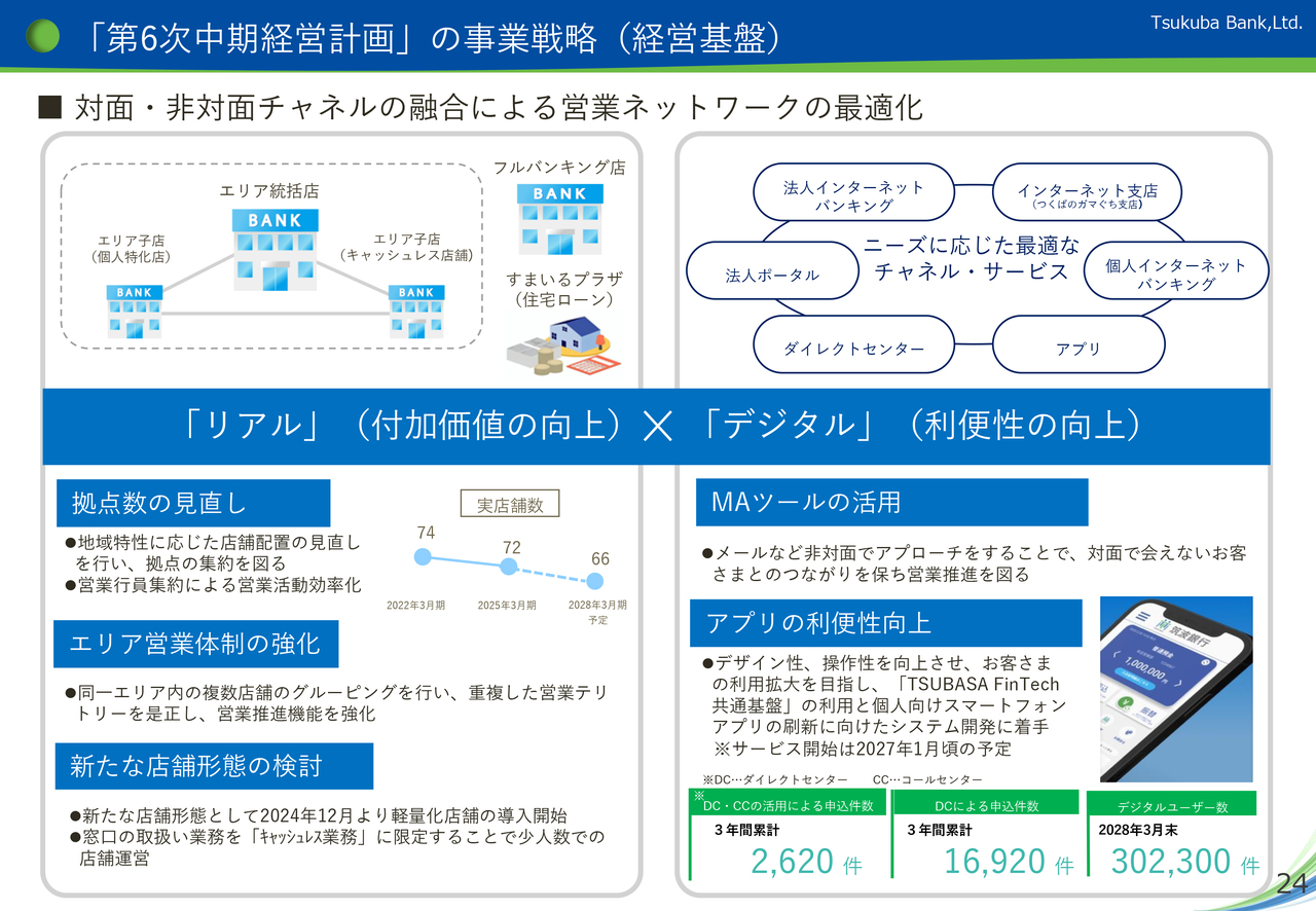 また、デジタル戦略の強化として、資料の右下に記載しているように、MAツールの活用やスマートフォンアプリの利便性向上を図ることで、2028年3月末のデジタルユーザー数302,300件を目指します。