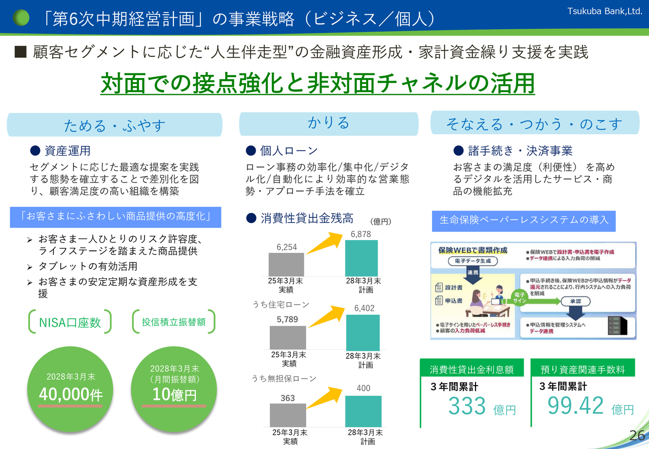 個人分野の取り組みを強化することで、NISA口座および投信積立振替額の増加を図るとともに、「第6次中期経営計画」最終期の消費性貸出残高6,878億円を目指します。また、KPIとして、消費性貸出金利息額を3年間累計で333億円、預り資産関連手数料を99.42億円としています。
