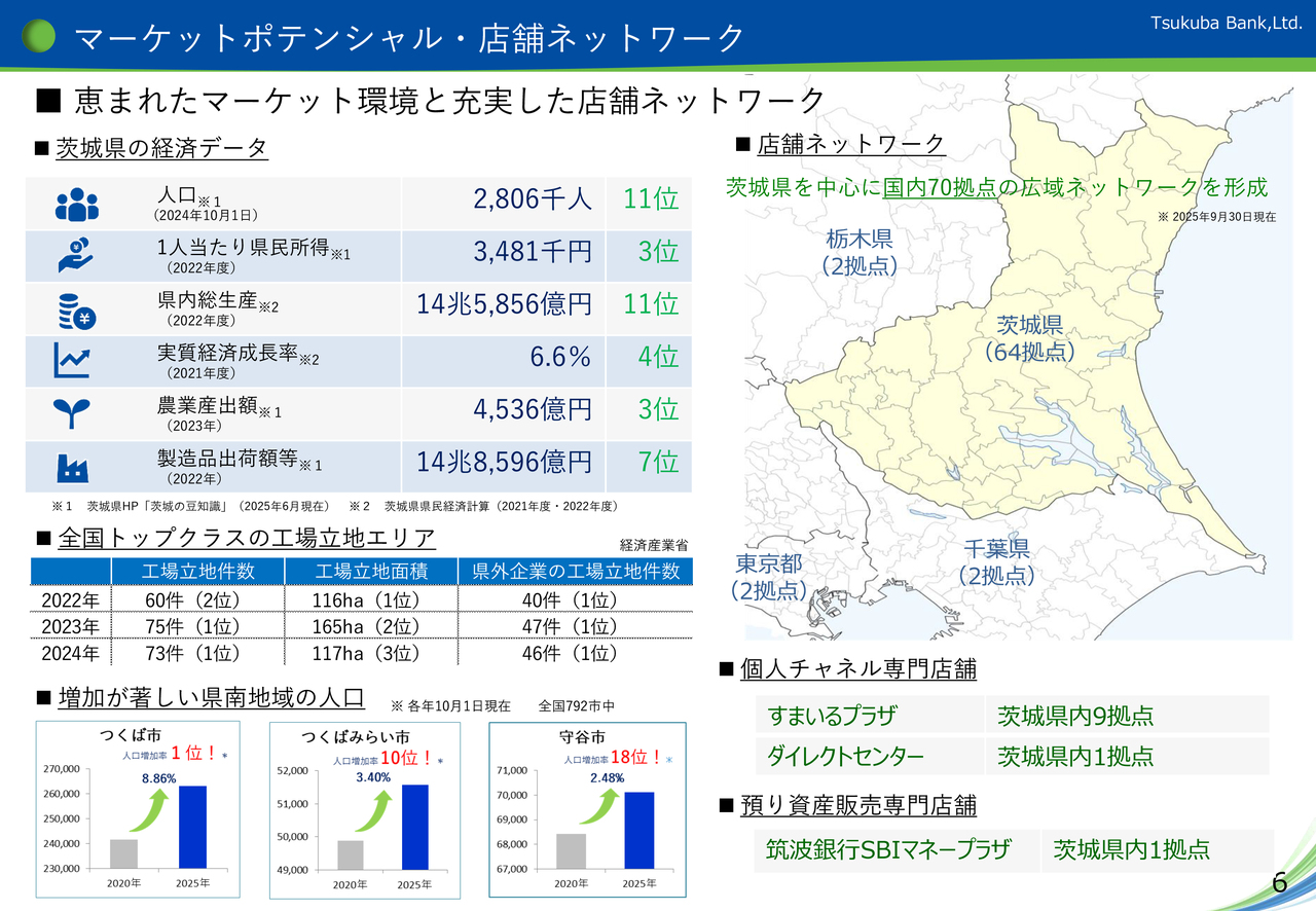 茨城県は、人口280万人を擁し、一人あたり県民所得および農業産出額は全国3位を誇ります。首都圏に近い立地の優位性や利便性の高い交通インフラの整備により、2024年の工場立地件数および県外企業の工場立地件数は全国1位となっています。こうした成長のポテンシャルの高い地域に、当行は70拠点の店舗ネットワークを有しています。