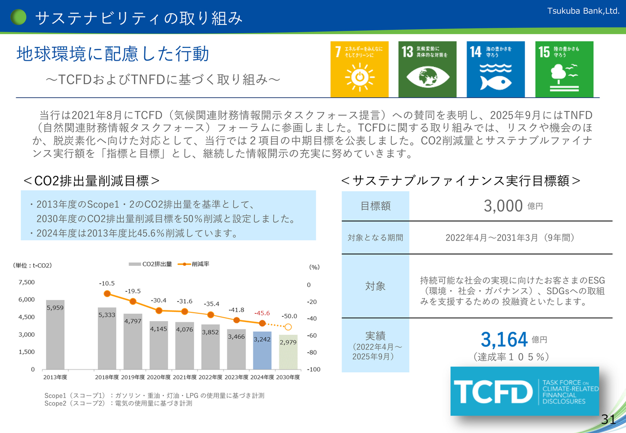 また、SDGsの取り組みを支援する融資である「サステナブルファイナンス実行額」は、2025年9月末時点で3,164億円の実行額となっており、これは2031年3月までの実行目標額である3,000億円を上回り、約6年前倒しで達成したことになります。