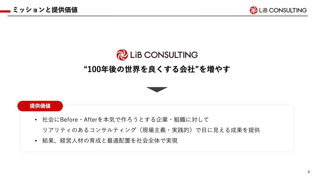 まずは会社概要についてです。当社は「“100年後の世界を良くする会社”を増やす」というミッションのもと活動しています。具体的には、優れた商品、サービス、思いを持つ企業が存続・発展・成長するための支援を行うコンサルティング業務を主業としています。