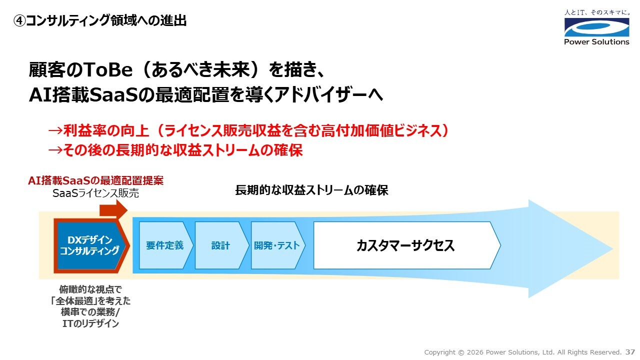 高橋:4つ目は、コンサルティング領域への進出です。「つかう」を中心としたソリューションを提供するためには、最上流のコンサルティング領域で顧客業務全体を俯瞰し、どの部分にどのAI搭載SaaSを配置すべきかをアドバイスする必要性が高まっています。そのため、このようなコンサルティング領域への進出が重要になると考えています。