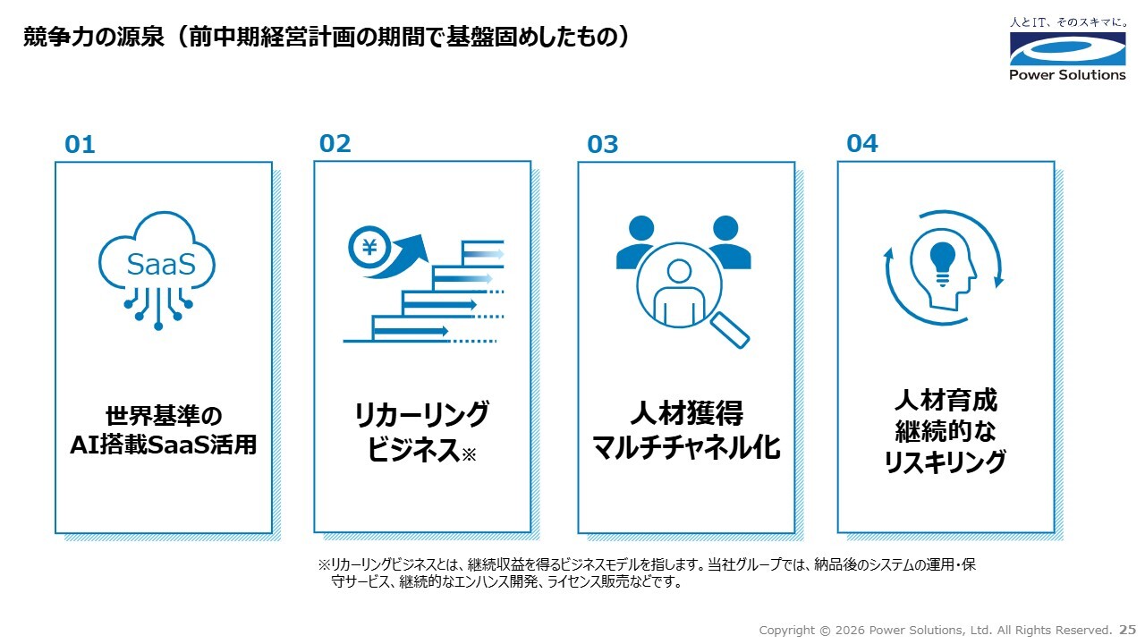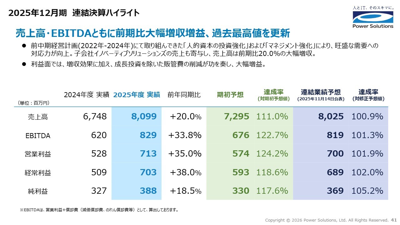 また、2025年は、想定を上回る需要を取り込んだ結果、計画を上回る利益水準となりましたが、今期の計画はこのような上振れ要因を織り込まない水準を前提に策定しています。その結果、オフィス移転に伴う費用の発生とあわせて、前期比では減益となっていますが、中期経営計画で示した2026年度のEBITDA水準は引き続き維持しています。