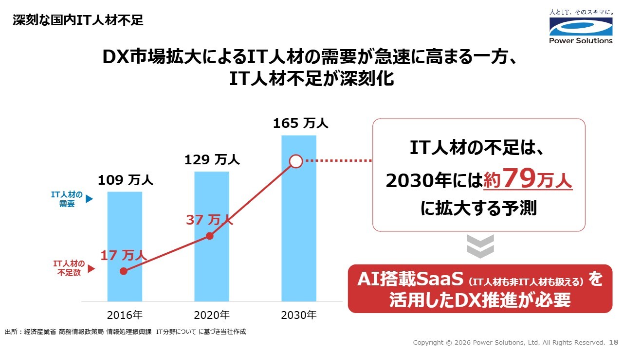 高橋:DX市場の成長性が高い一方で、国内のIT人材の供給が追いついていない状況です。このIT人材不足は、将来的にさらに拡大すると予測されています。