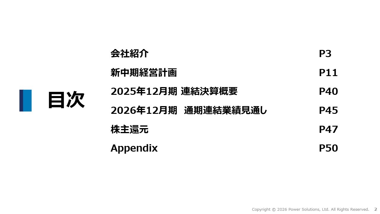 高橋:本日の目次です。まず会社説明を行い、次に2025年2月に公表した中期経営計画を通じて当社の事業環境や成長戦略を説明します。その後、2025年度の連結決算概要と2026年度の通期連結業績見通しについてご説明し、最後に株主還元についてご説明します。