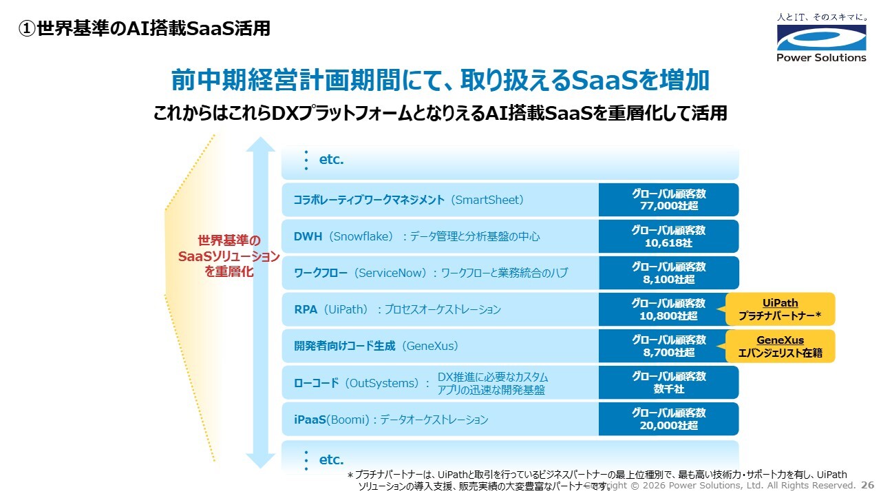 もう1つは、AI搭載SaaSに関する専門知見です。プラチナティアである「UiPath」をはじめ、エバンジェリストが在籍する「GeneXus」や「Smartsheet」、さらに「Boomi」「OutSystems」「Snowflake」など、ライセンス販売が可能なSaaSの取り扱いが増え、この専門知見が当社が選ばれる理由となっています。