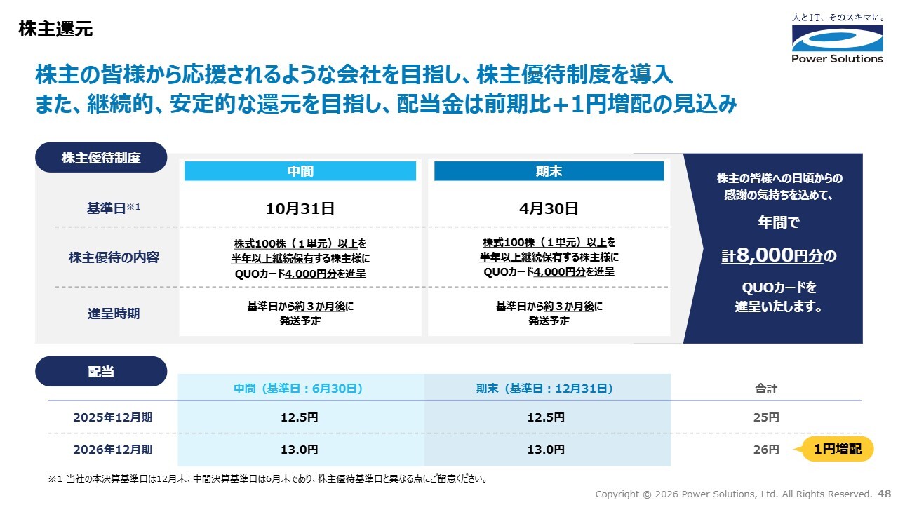 高橋:株主還元についてです。当社は株主のみなさまから応援されるような会社を目標としており、2024年から配当、2025年から株主優待を実施しています。2026年の配当は前期比で年間1円の増配を予定しており、株主優待では年間8,000円分のQUOカードを進呈します。