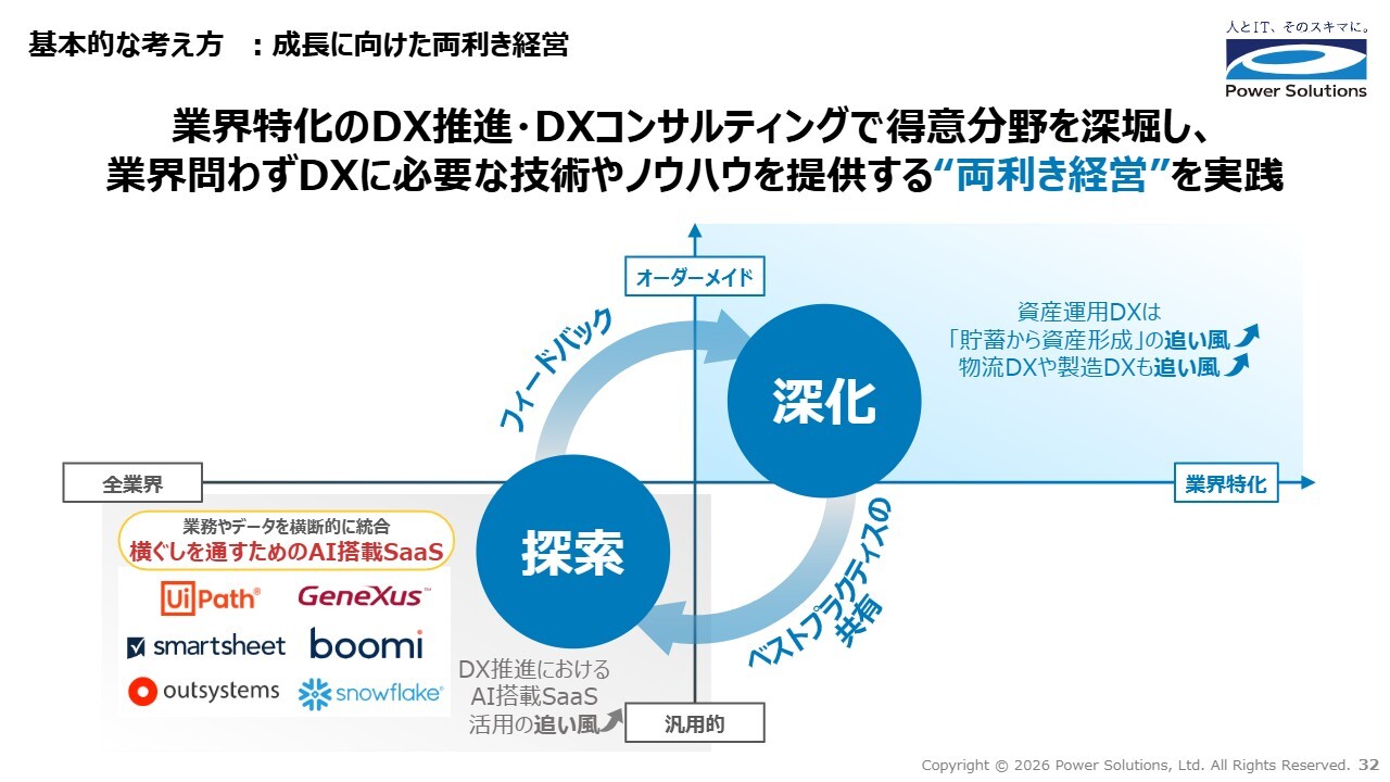 「深化」は「貯蓄から資産形成」の追い風、物流DXや製造DXといった非金融のDX需要の増加も追い風です。「探索」は業界を問わないDXテーマである「AI搭載SaaS活用」の追い風という、2つの追い風を受けていると考えています。