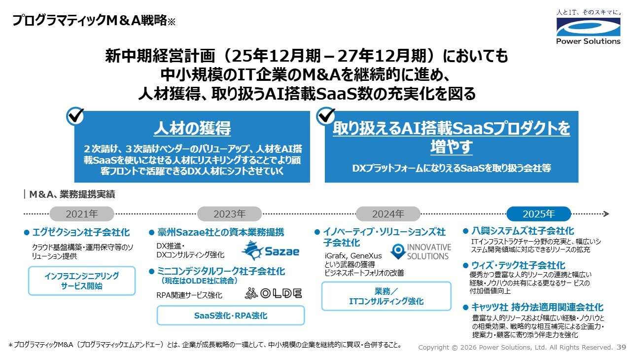 当社のM&Aの目的は、大きく分けて「人材の獲得」と「取り扱えるAI搭載SaaSプロダクトを増やす」の2つです。2025年には新たに3社をM&Aの対象とし、着実にグループ規模を拡大しています。今後も、M&Aを継続的に行うプログラマティックM&Aを進めていきます。