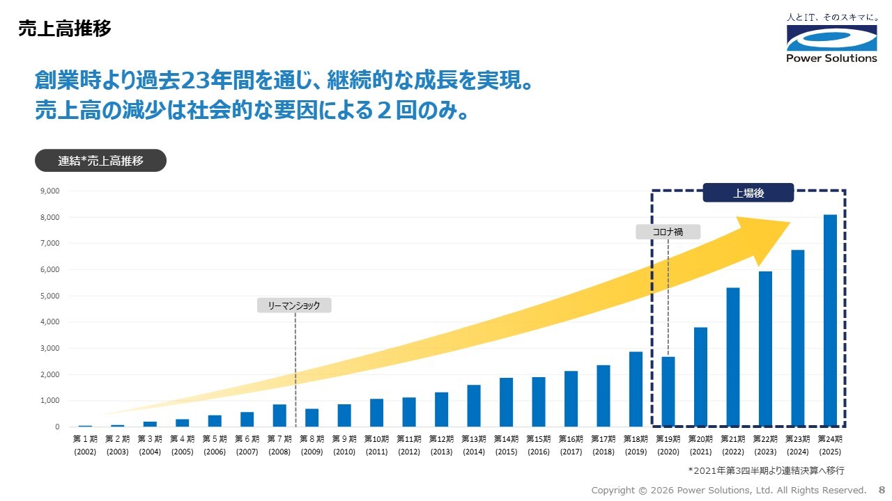 高橋:創業時からの売上推移を示すグラフです。当社グループは創業時から継続的な成長を実現しており、売上高は安定して伸び続けています。