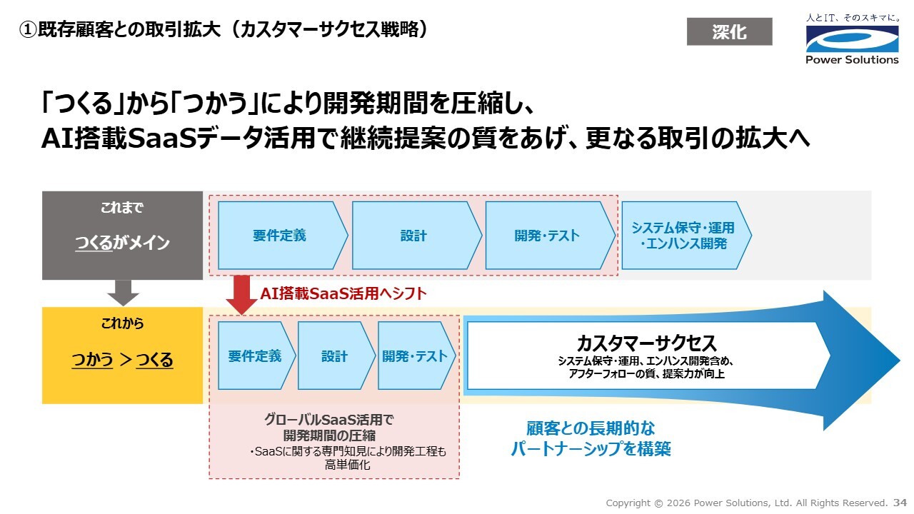 高橋:1つ目は、既存顧客との取引拡大です。これまでは「つくる」がメインでしたが、「つくる」から「つかう」にシフトし、共通中間解としてのビジネスインフラとなり得るAI搭載SaaSやデータを活用することで、開発期間を短縮します。さらに、その基盤を利用することで継続提案の質を向上させ、取引を拡大していきます。