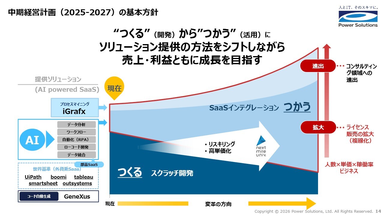 現時点では、まだ「つくる」が大半を占めていますが、スライド左側にある前中計期間で取り扱いを増やしてきたSaaSを活用し、この3年で「つかう」中心のソリューション提供へとシフトしていくことを考えています。これにより、これまでの「人数×単価×稼働率」というビジネスに、複数のライセンス販売による収益機会が創出されます。