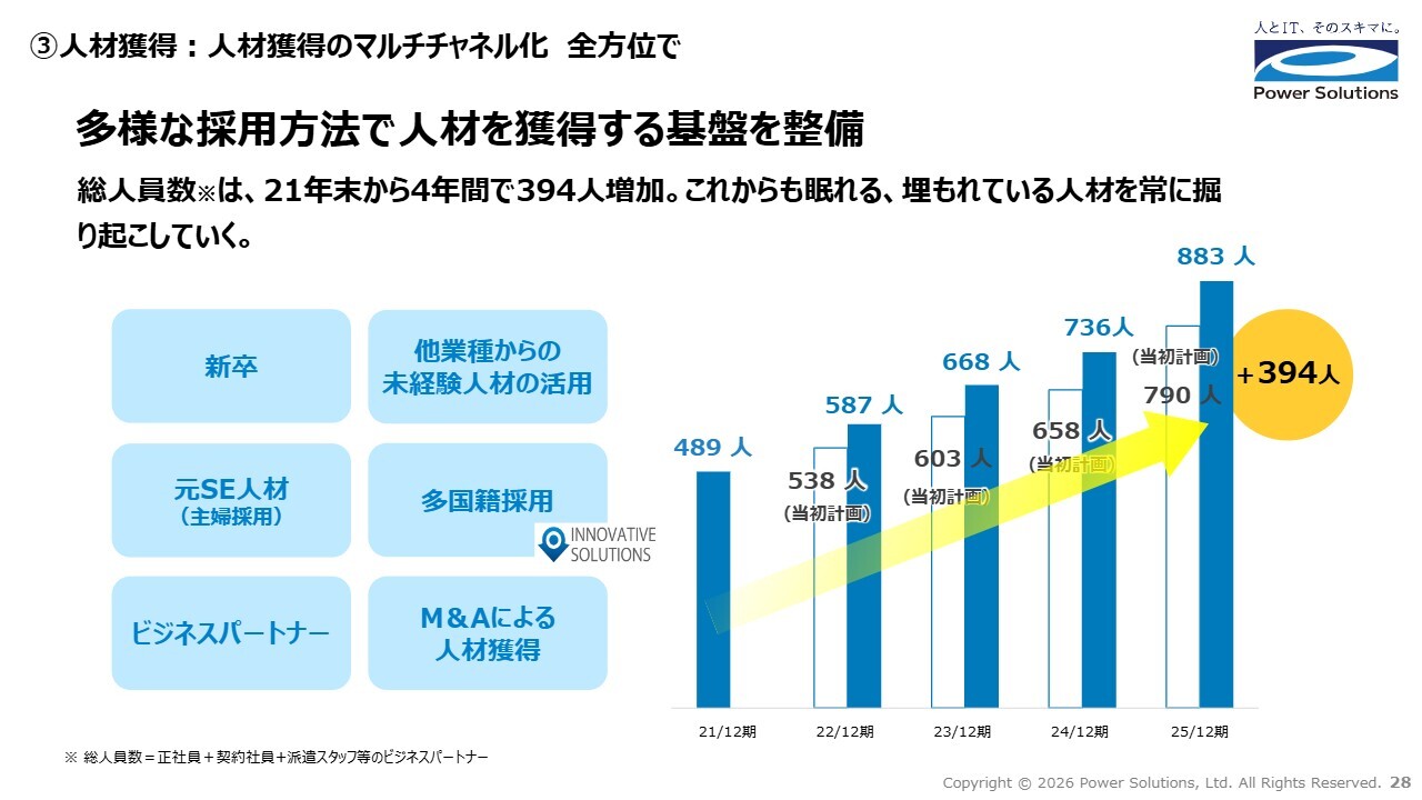 高橋:3つ目は、人材獲得です。当社は一般的な新卒採用やキャリア採用に限らず、他業種未経験者の採用、元SEの主婦の方の採用、多国籍採用、ビジネスパートナーの活用、M&Aなど、さまざまな方法で人材を獲得することで、安定的に人材を増加させてきています。
