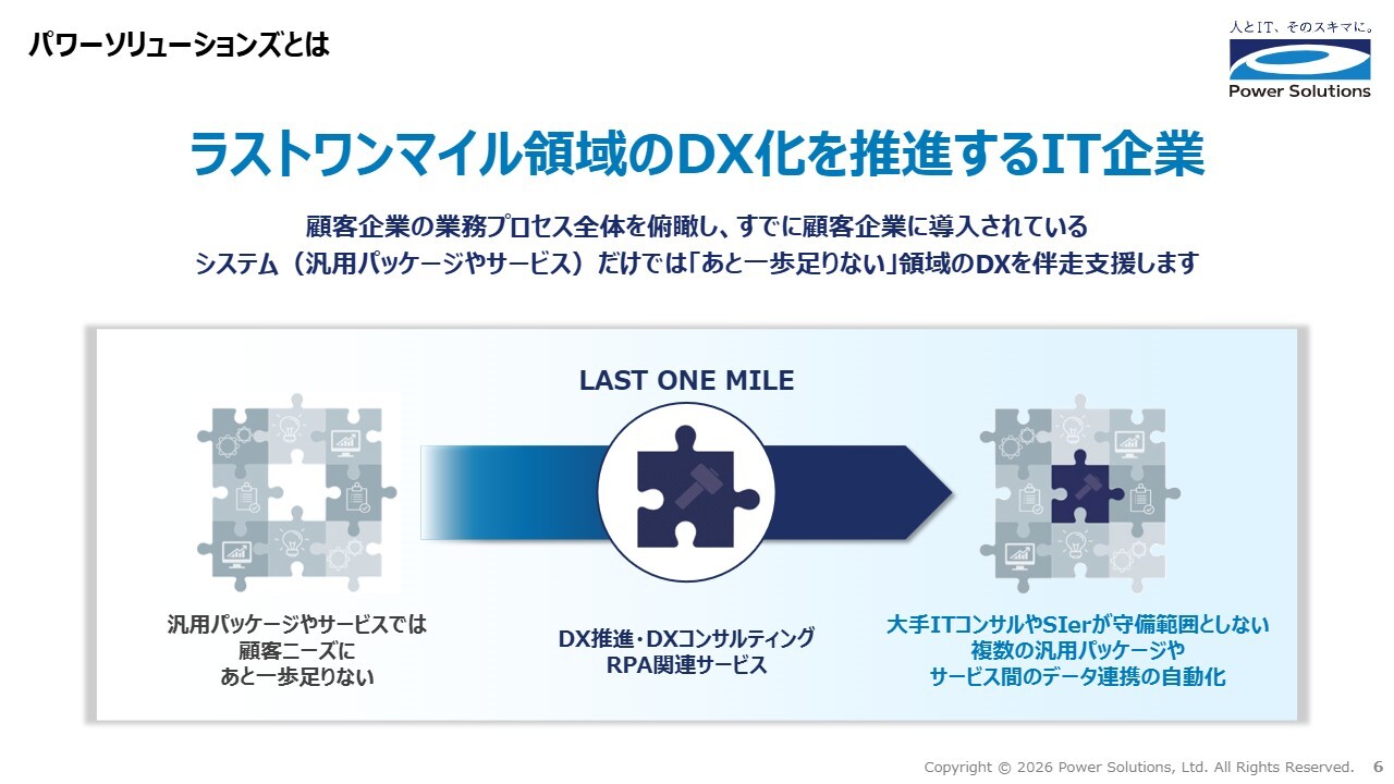高橋:パワーソリューションズは、簡単に言うと、ラストワンマイル領域のDX化を推進するIT企業です。ラストワンマイルとは、顧客企業がすでに導入している業界スタンダードな汎用パッケージやサービスと、それらのユーザーの間に存在するスキマ領域の業務を指します。