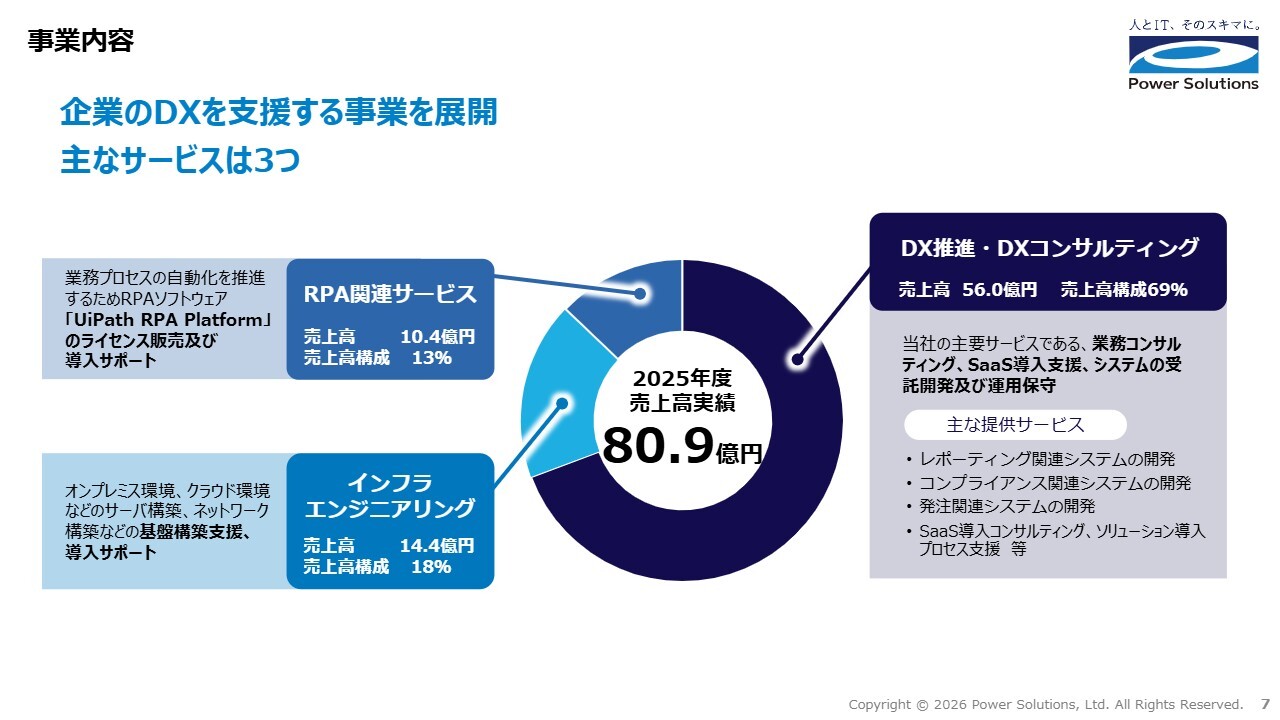 高橋:当社グループの事業内容についてご説明します。パワーソリューションズはBtoBのIT企業として、お客さまのDXを支援する3つのサービスを提供しています。