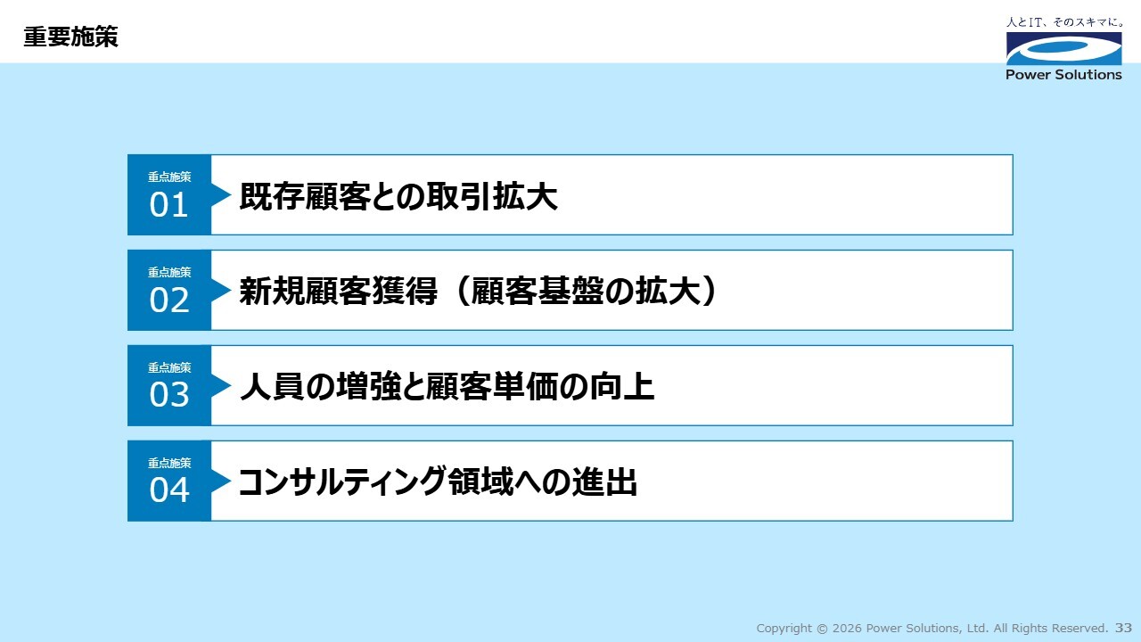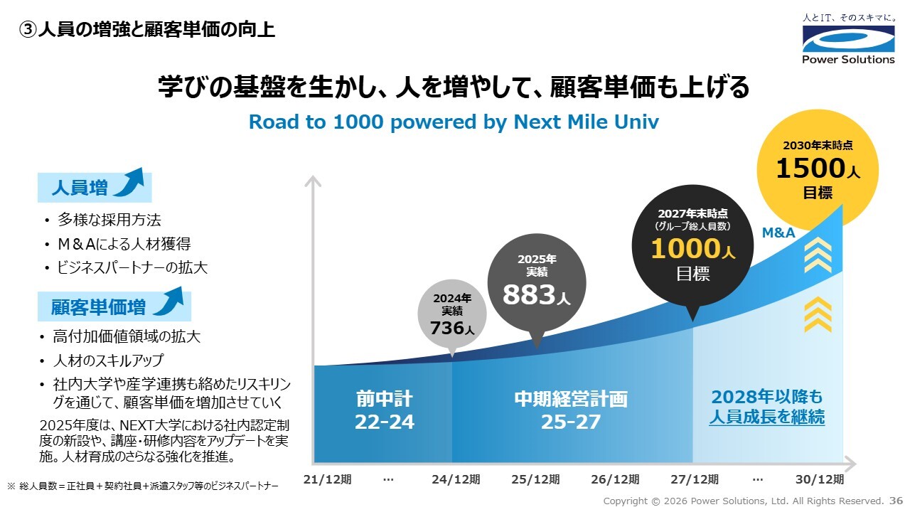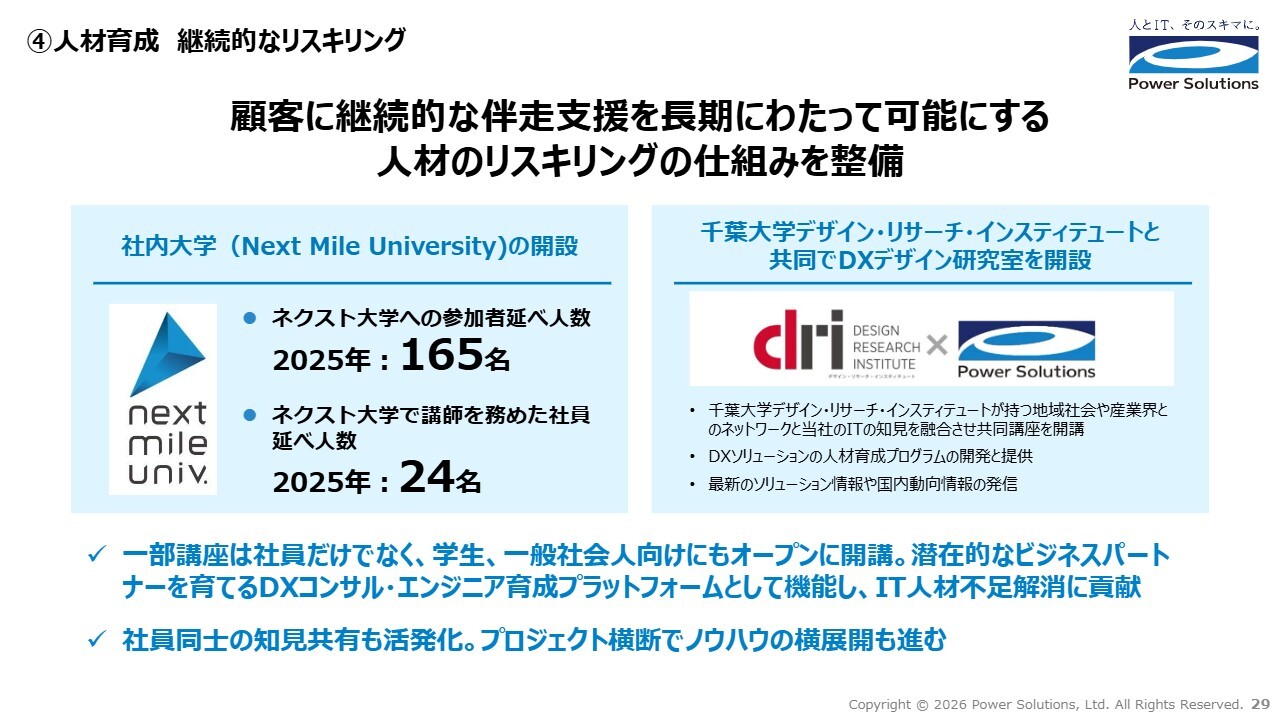 高橋:3つ目は、人員の増強と顧客単価の向上です。社内大学という学びの基盤を活かし、人材拡大とスキル高度化を両輪で進めます。リスキリングとアップスキリングによって付加価値を高め、持続的に顧客単価を向上させる成長サイクルを構築します。