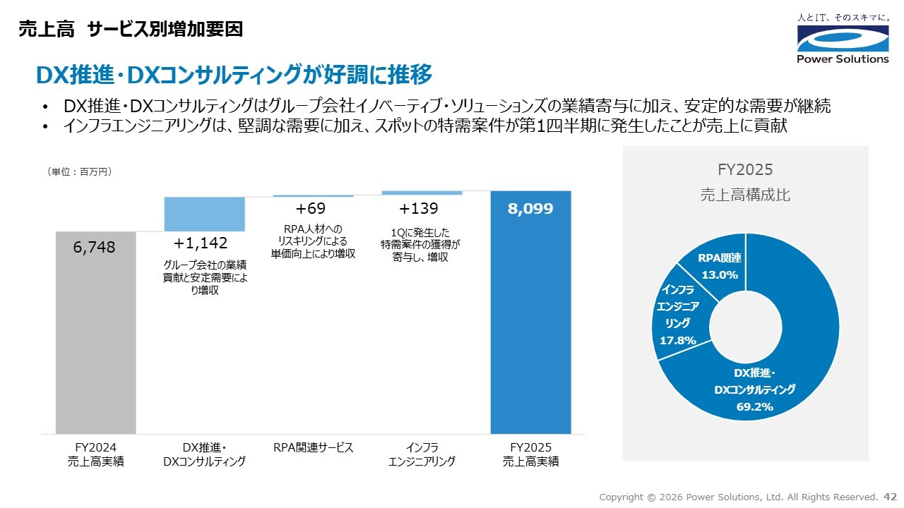 売上の主な成長要因は、DX推進およびDXコンサルティングサービスへの想定を超える需要があったことに加え、2025年度から通期の連結対象となったイノベーティブ・ソリューションズ社の成績が通期で寄与したことが挙げられます。