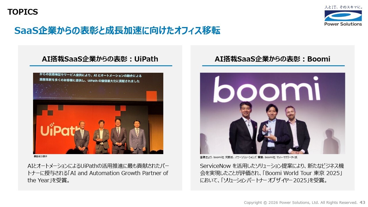 トピックスです。当社はお客さまへのソリューション提供において、複数のAI搭載SaaSを基盤として活用しています。これらのSaaSの活用推進やその実績は、SaaS企業からも高く評価されており、2025年にはUiPath社およびBoomi社から、それぞれパートナーオブザイヤーの表彰を受けました。