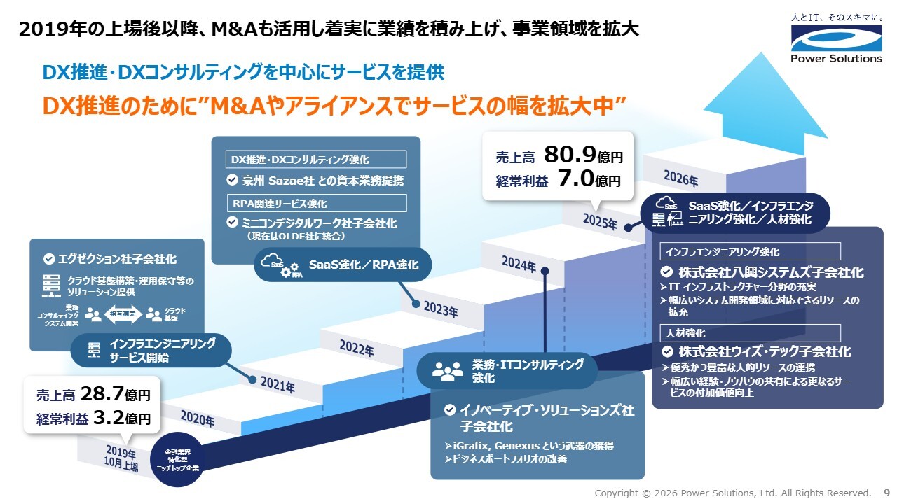 2019年の上場後以降、M&Aも活用し着実に業績を積み上げ、事業領域を拡大