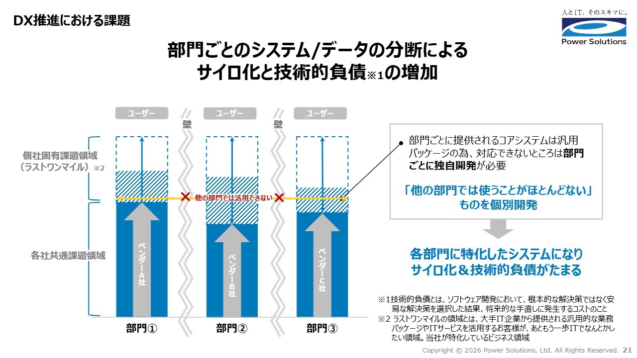 スライドの図にあるように、部門ごとに使用されているコアシステムは、汎用パッケージや、大手SIerが開発したシステムであることが多い状況です。そのため、個社固有の課題については、部門ごとに独自開発が行われています。