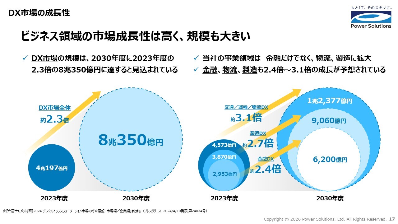 当社の事業領域は、金融だけでなく、物流や製造にも広がっており、これらの分野はDX市場全体を上回る成長が予想される領域です。
