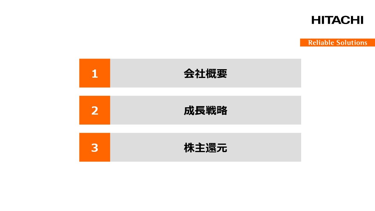 小俣貴之氏(以下、小俣):日立建機株式会社ブランド・コミュニケーション本部広報・IR部長の小俣です。よろしくお願いします。本日ご説明するのは、スライドに記載の3点です。