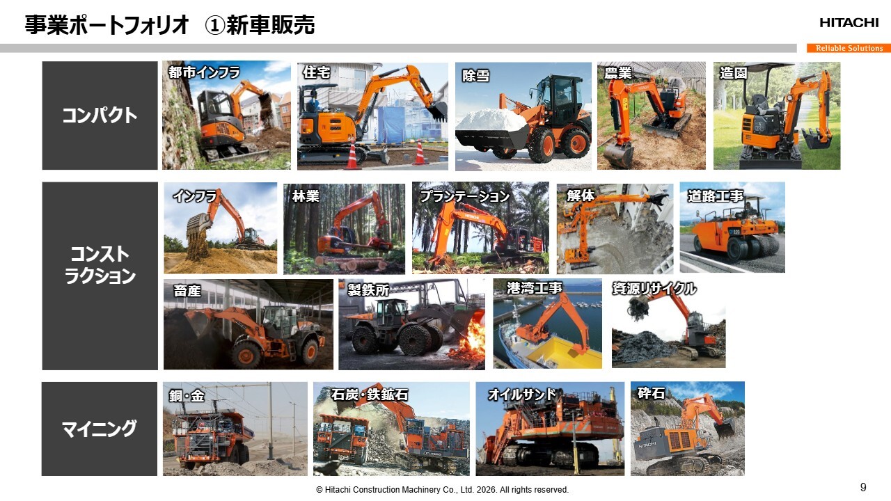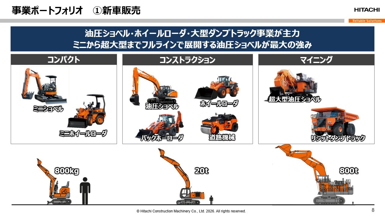 まずは新車販売事業です。当社の製品は、大きさによって3つに分類されます。コンパクトは小型機、コンストラクションは工事現場などで活躍する中型・大型機、そしてマイニングは海外の鉱山などで使用される超大型機が含まれます。
