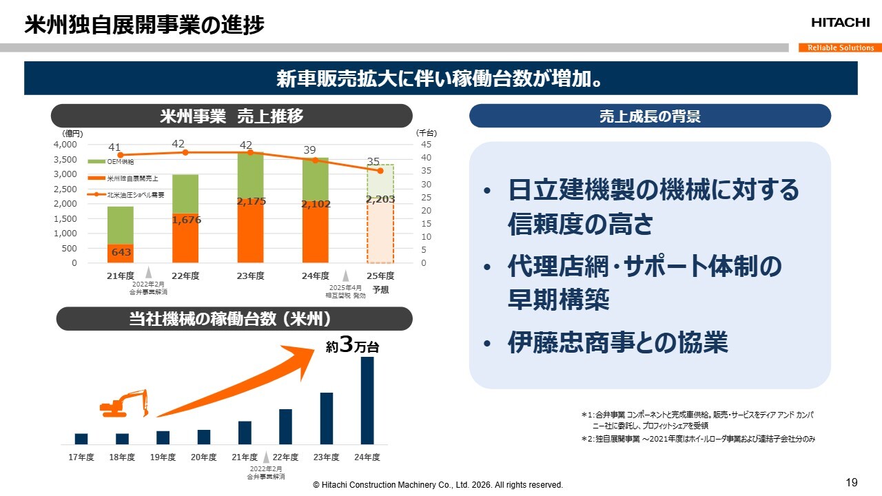 2025年に相互関税が導入されたことで売上は一時的に落ち込みましたが、当社の稼働台数は着実に増加しています。この成長の背景には、当社の機械への高い信頼性、代理店網やサポート体制を早期に構築できたこと、さらに伊藤忠商事との協業が寄与しています。