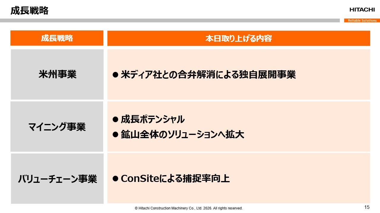 回答:仮にマイニング需要が一時的に想定を下回る局面となった場合でも、他の成長ドライバーとして、米州における一般建機事業の拡大があります。当社は米州で独自展開を進めており、油圧ショベルを中心にリテールシェアの拡大が着実に進んでいます。北米ではインフラ投資やデータセンター関連工事などを背景に、一般建機の底堅い需要が見込まれており、成長領域と位置づけています。
