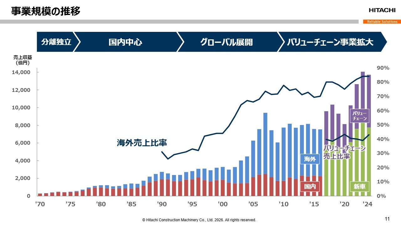 小俣:事業規模の推移をご説明します。2000年代頃からグローバル展開を本格化し、売上を伸ばしてきました。海外比率は現在80パーセントを超えるまでに上昇しています。