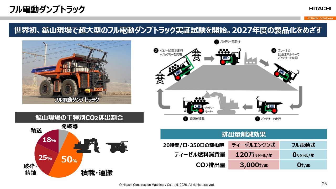 また当社では、フル電動化には至らないものの、ハイブリッドダンプトラックの設計にも着手しており、2027年からアフリカの鉱山で実証実験を開始し、2030年の実用化を目指しています。