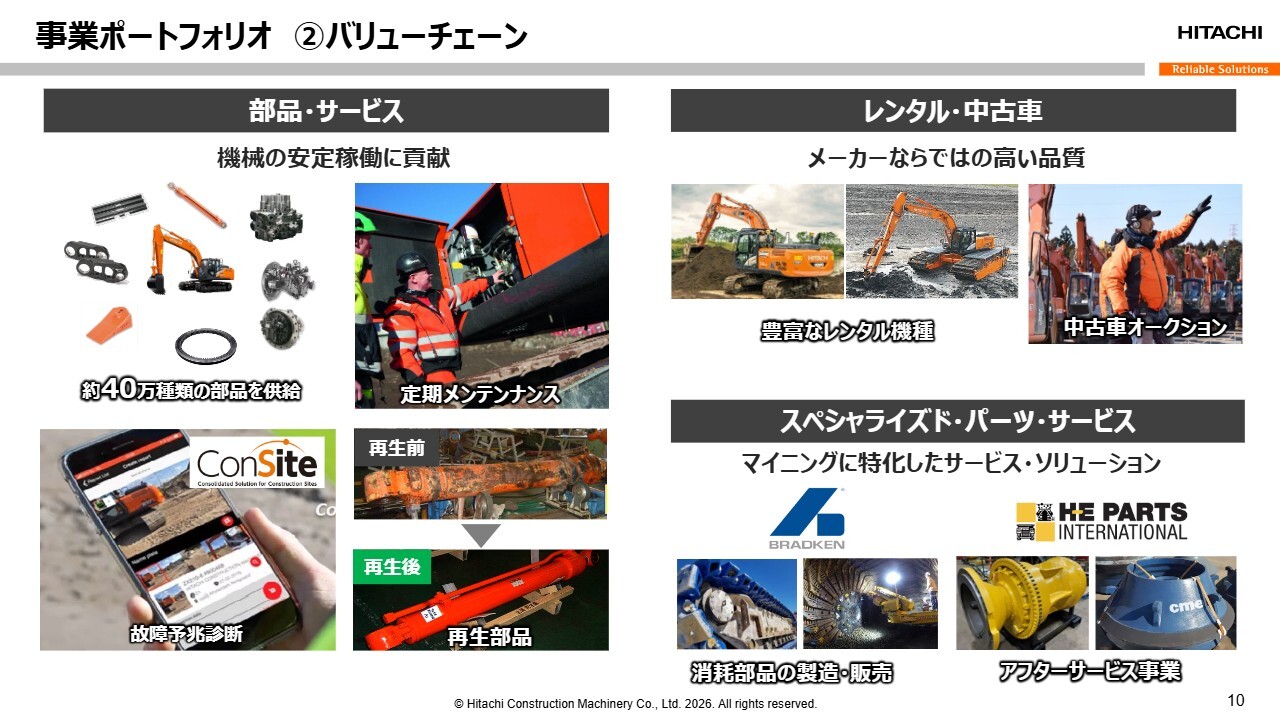 小俣:バリューチェーン事業をご説明します。バリューチェーン事業とは、新車の販売以外の事業を指します。部品・サービスやレンタル・中古車事業、マイニングの部品再生事業、そしてアフターサービスを担うスペシャライズド・パーツ・サービスが該当します。