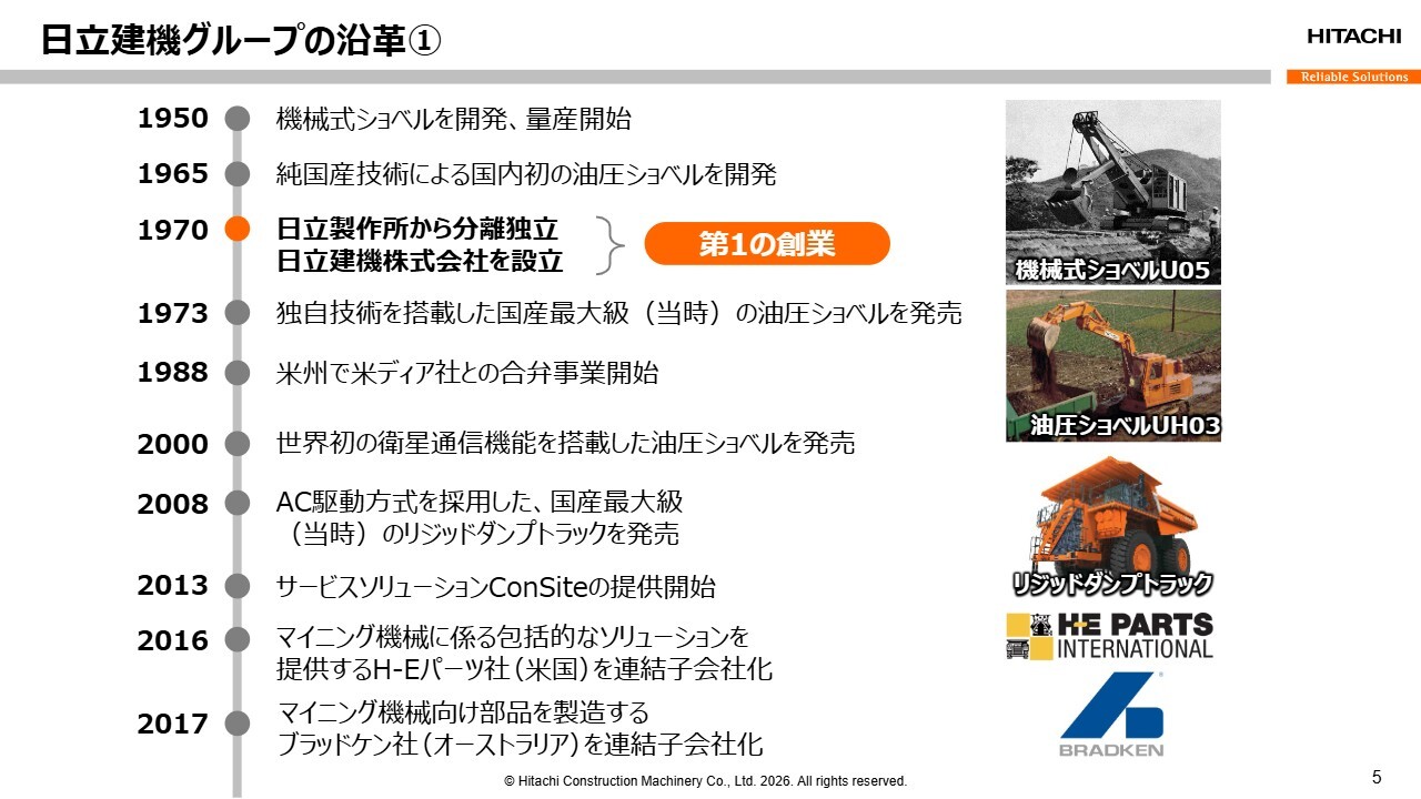 小俣:当社の歴史は、日立製作所で初めて機械式ショベルを開発し、量産を開始した1950年にさかのぼります。その後、1970年に日立製作所から分離独立しました。