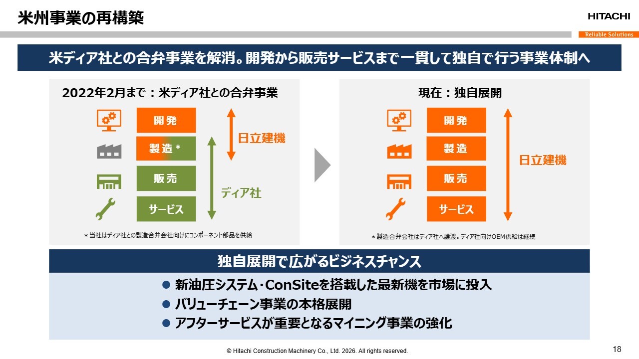 小俣:1点目は、米州事業です。米州では、40年以上にわたりディア社と事業を展開してきました。しかし、市場のお客さまからは新車の販売だけではなく、アフターサービスや遠隔での機械管理など、幅広いソリューションを求められるようになっていました。