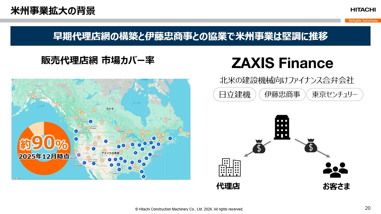 現在では、北米で27社、南米で11社と契約し、市場の約90パーセントをカバーする体制を構築しています。また、伊藤忠商事、東京センチュリー、当社の3社が出資してファイナンスの合弁会社、ZAXIS Financeを設立し北米における金融サービス体制を拡充しました。