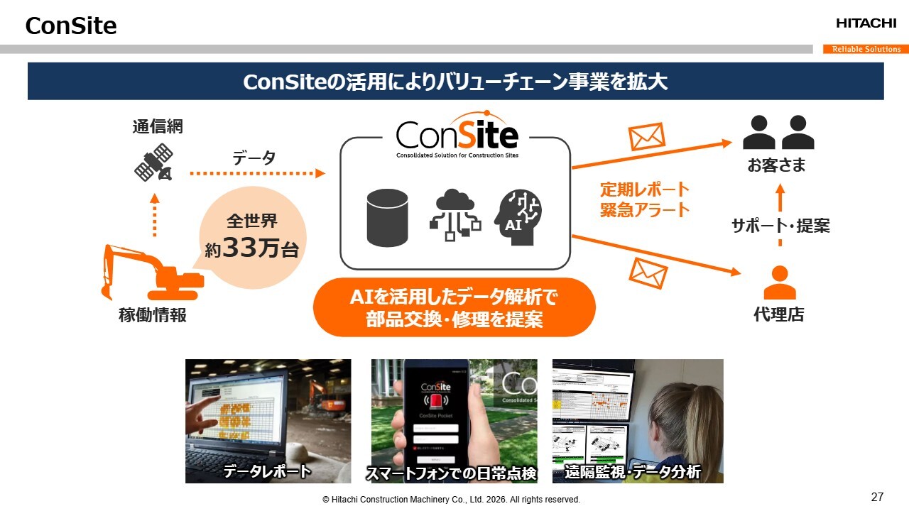 小俣:先ほどの「ConSite」に関連する話になりますが、「ConSite」は、こういった機械に通信機能が搭載されており、世界中のどこにいてどのような仕事をしているのか、またどれだけの負荷がかかっているのかがわかります。