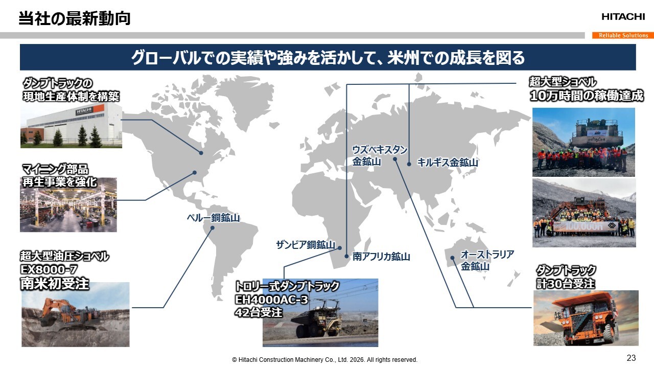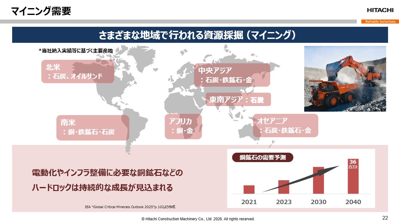 小俣:現在、南米での受注はまだですが、資料にも示していますように、例えばアフリカで銅を採掘しているお客さまから、一度に40台以上のダンプトラックを注文いただくケースがあります。また、オセアニアや中央アジアで金を採掘しているお客さまからも、ダンプトラックをまとめて注文いただく事例が直近で発生しています。