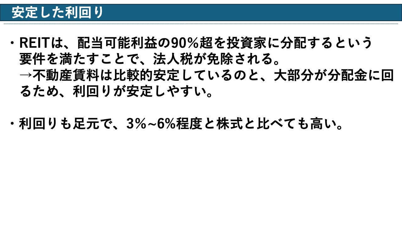 まずは「安定した利回り」です。こちらは制度上・設計上の理由もありますが、配当可能利益の90パーセント超を投資家に分配するという要件を満たすことで、法人税が免除されます。