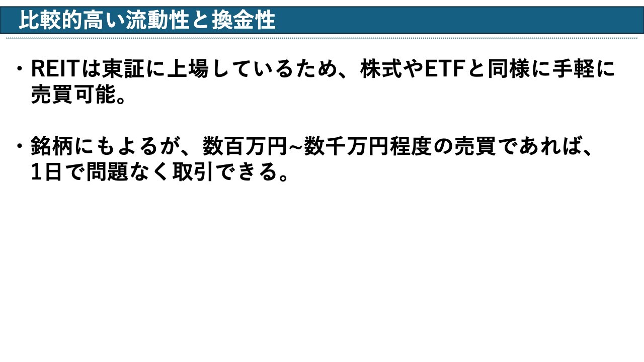 「比較的高い流動性と換金性」についてです。先ほども少しお話ししたのですが、REITの場合は上場していますので、株式やETFと同じように手軽に売買できます。