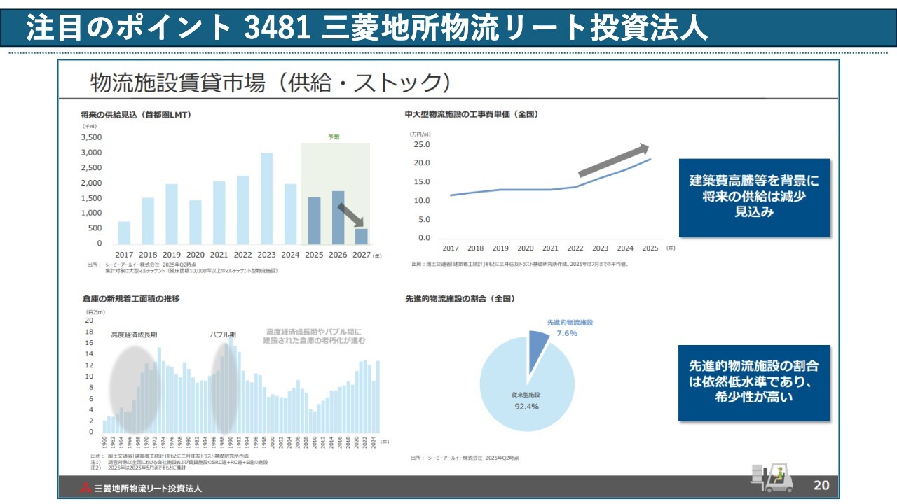 3つ目は、三菱地所物流リート投資法人です。こちらは物流施設がメインだと思いますが、非常に注目していることとして、建設費用が高騰している状況があります。