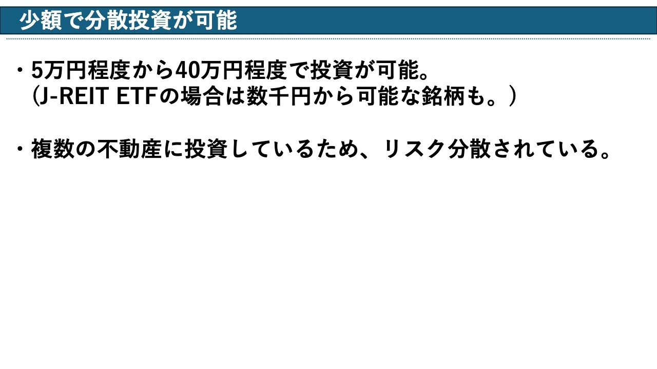 「少額で分散投資が可能」という点についてです。5万円程度から40万円程度で投資が可能なところが多いです。J-REITはETFもありますので、この場合は数千円から可能な銘柄もあります。
