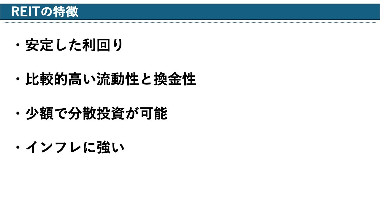 スライドではREITの特徴を簡単にまとめています。各項目について解説します。