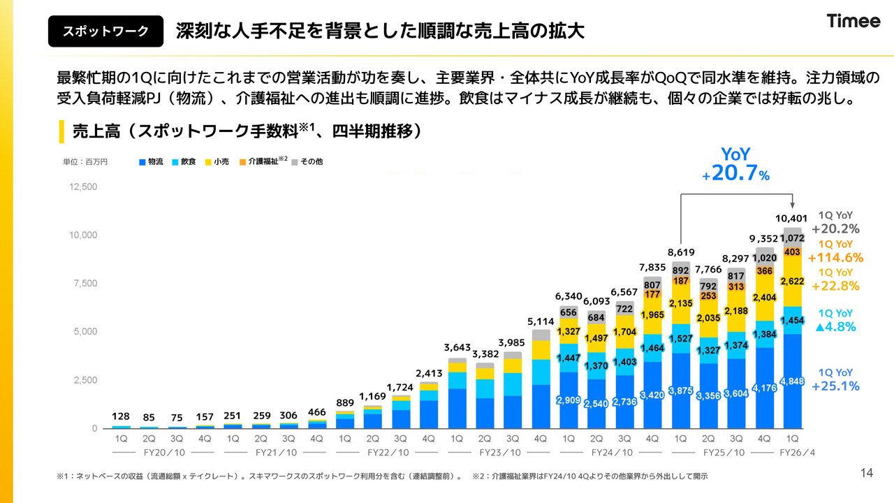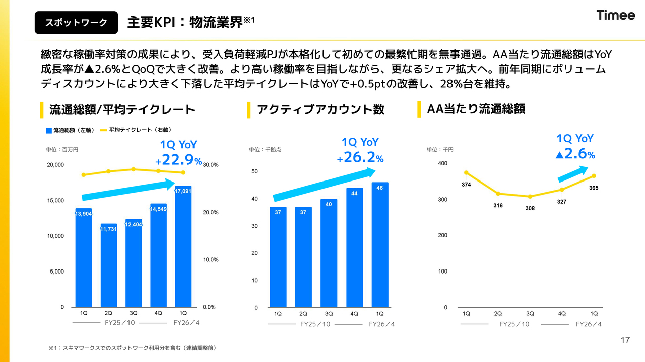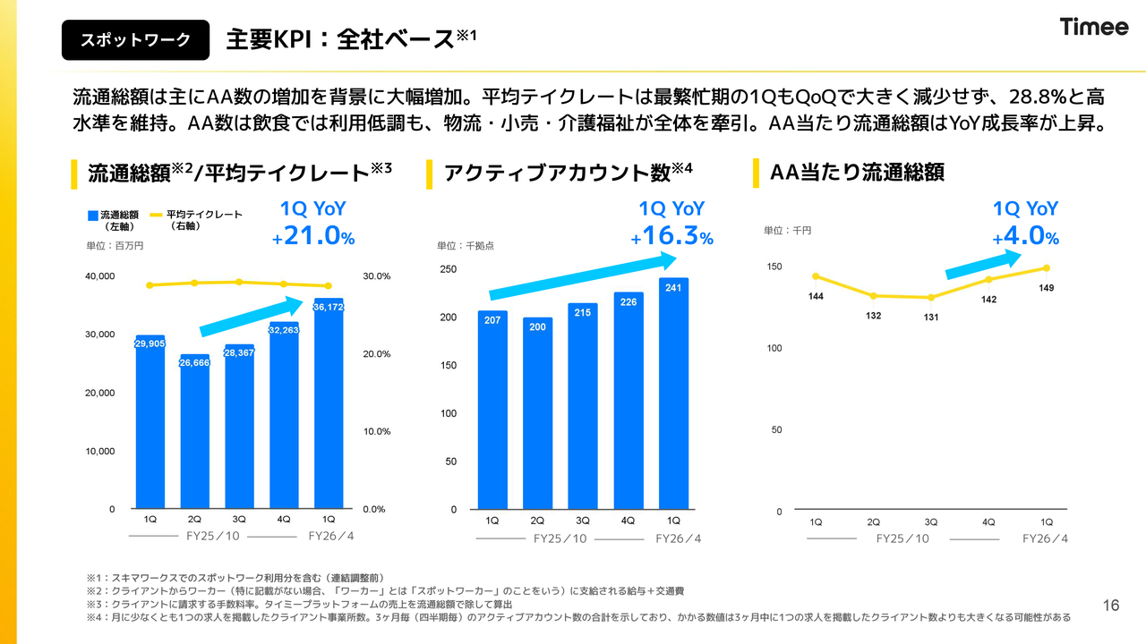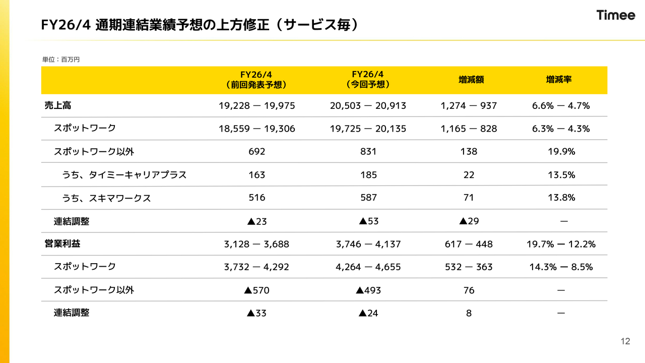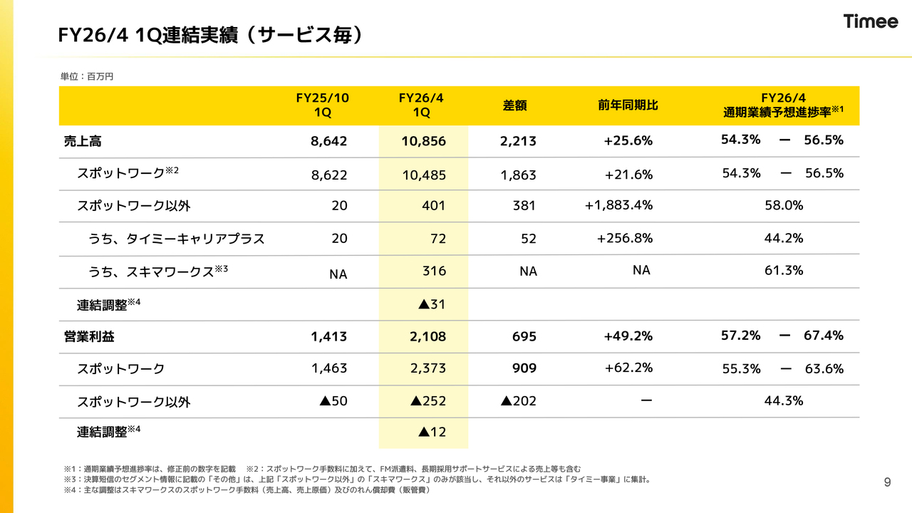 今回から、連結、スポットワーク、「タイミーキャリアプラス」「スキマワークス」などのスポットワーク以外に分類しています。この分類は、前四半期の昨年12月に決算発表を行った際に開示したスポットワークとスポットワーク以外に基づいたガイダンスに沿っています。
