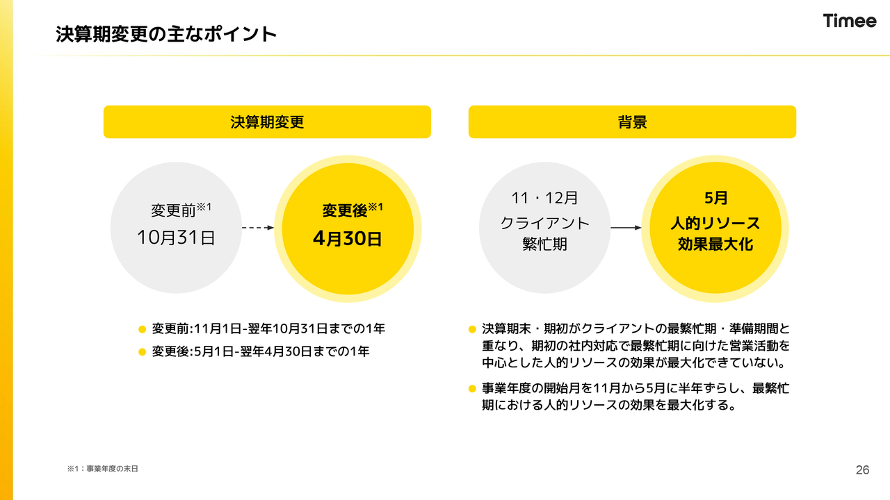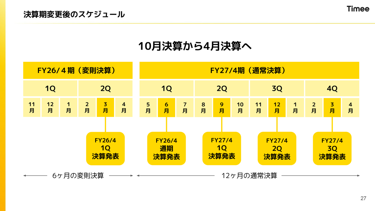 したがって、変則決算となるため6ヶ月の決算となります。第2四半期で期末を迎え、新しい期は5月から始まる予定です。次の決算では、通期決算を行うとともに、来期である2027年4月期の業績予想を含めたガイダンスを開示する予定です。