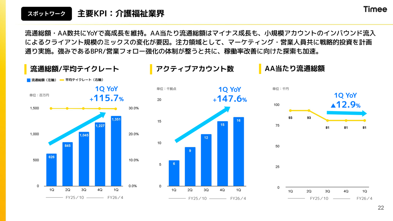 介護福祉業界では、アクティブアカウント当たり流通総額は小規模クライアントのミックスによりマイナスとなっています。しかし、アクティブアカウント数が顕著に増加しており、これが全体の成長を押し上げています。