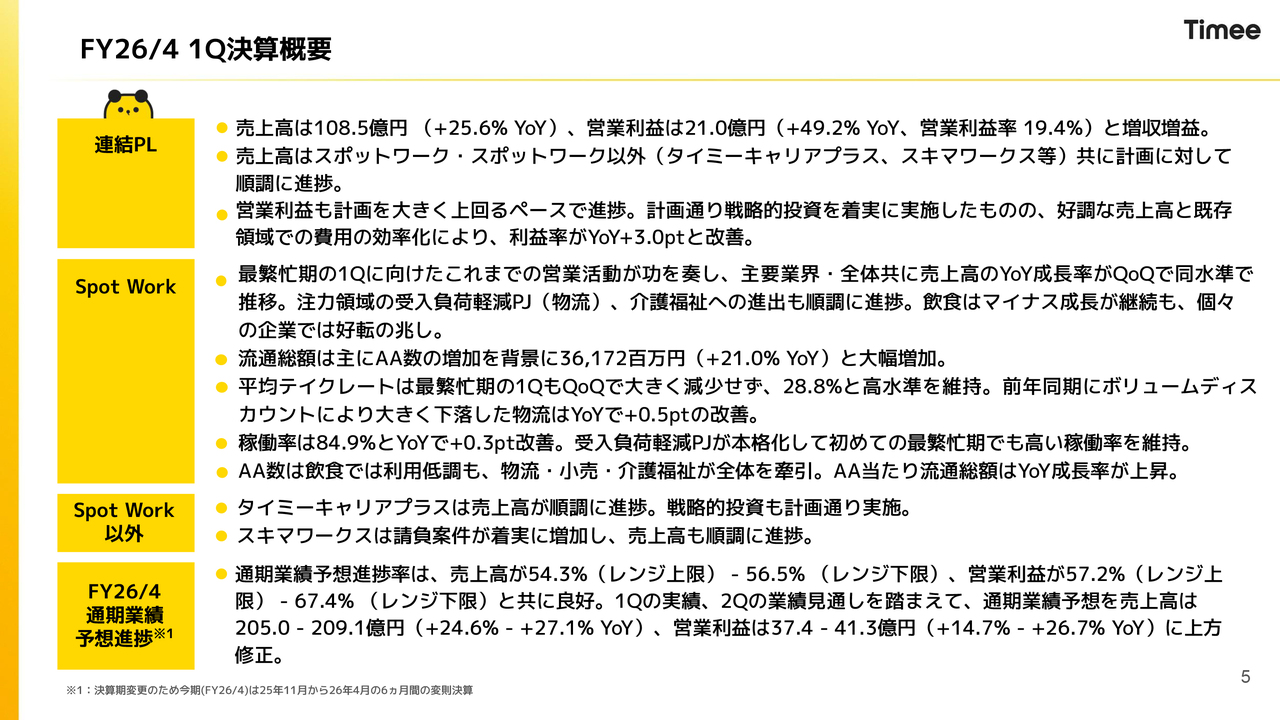 小川嶺氏(以下、小川):株式会社タイミー代表取締役の小川です。本日はお忙しい中お集まりいただきまして、誠にありがとうございます。2026年4月期第1四半期の決算説明を行いたいと思います。