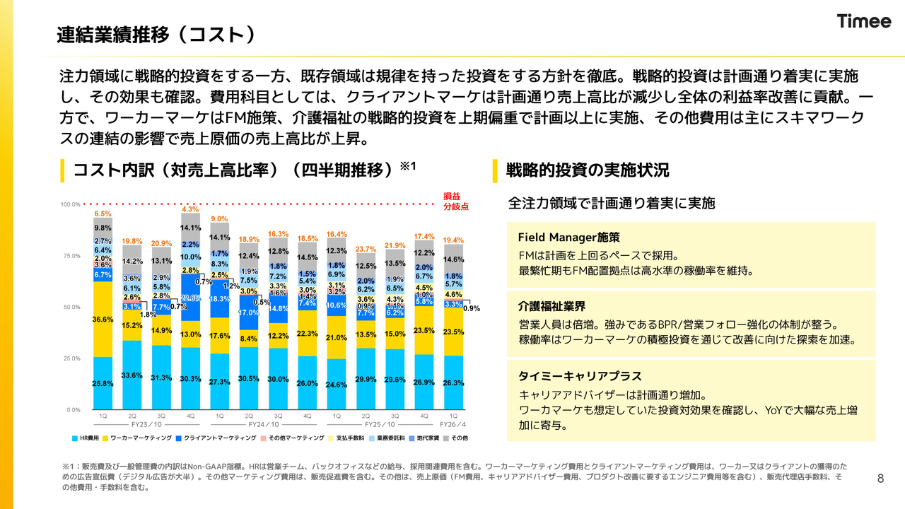 コストについて、大きなトレンドに変化はありません。今期から戦略的な投資を進めていることから、スライド右側に記載した、Field Manager施策や介護福祉業界、「タイミーキャリアプラス」については、計画どおり着実に戦略的な投資を行ってきています。